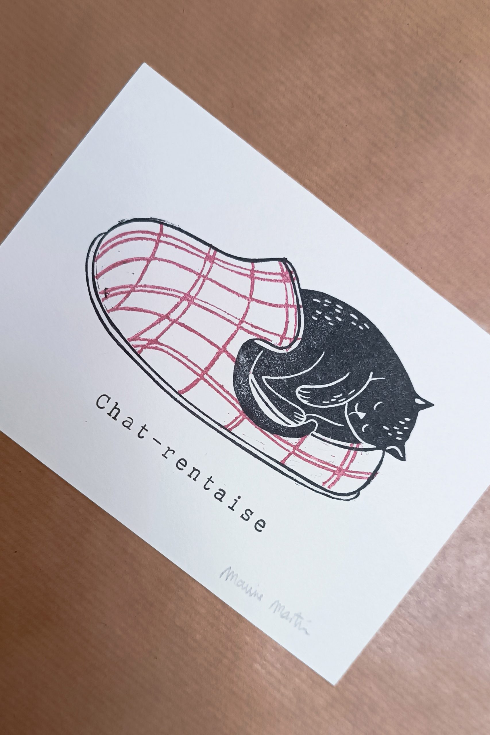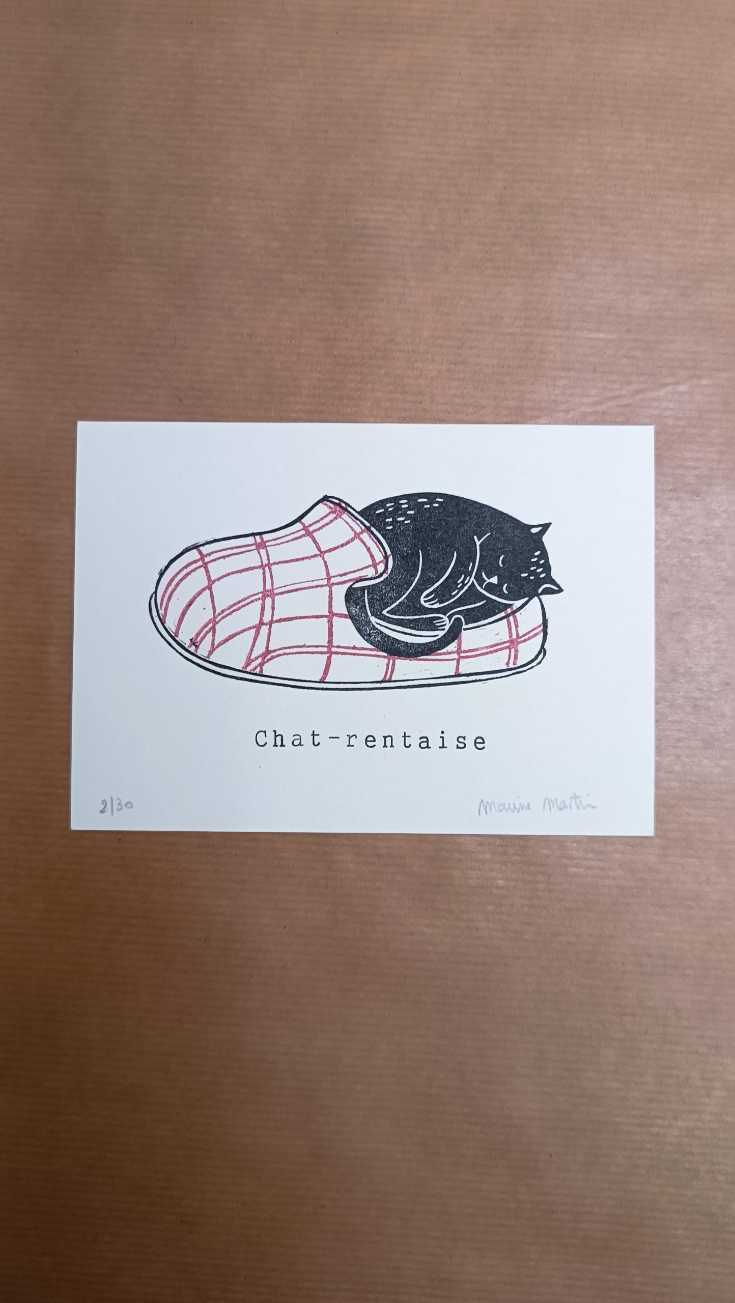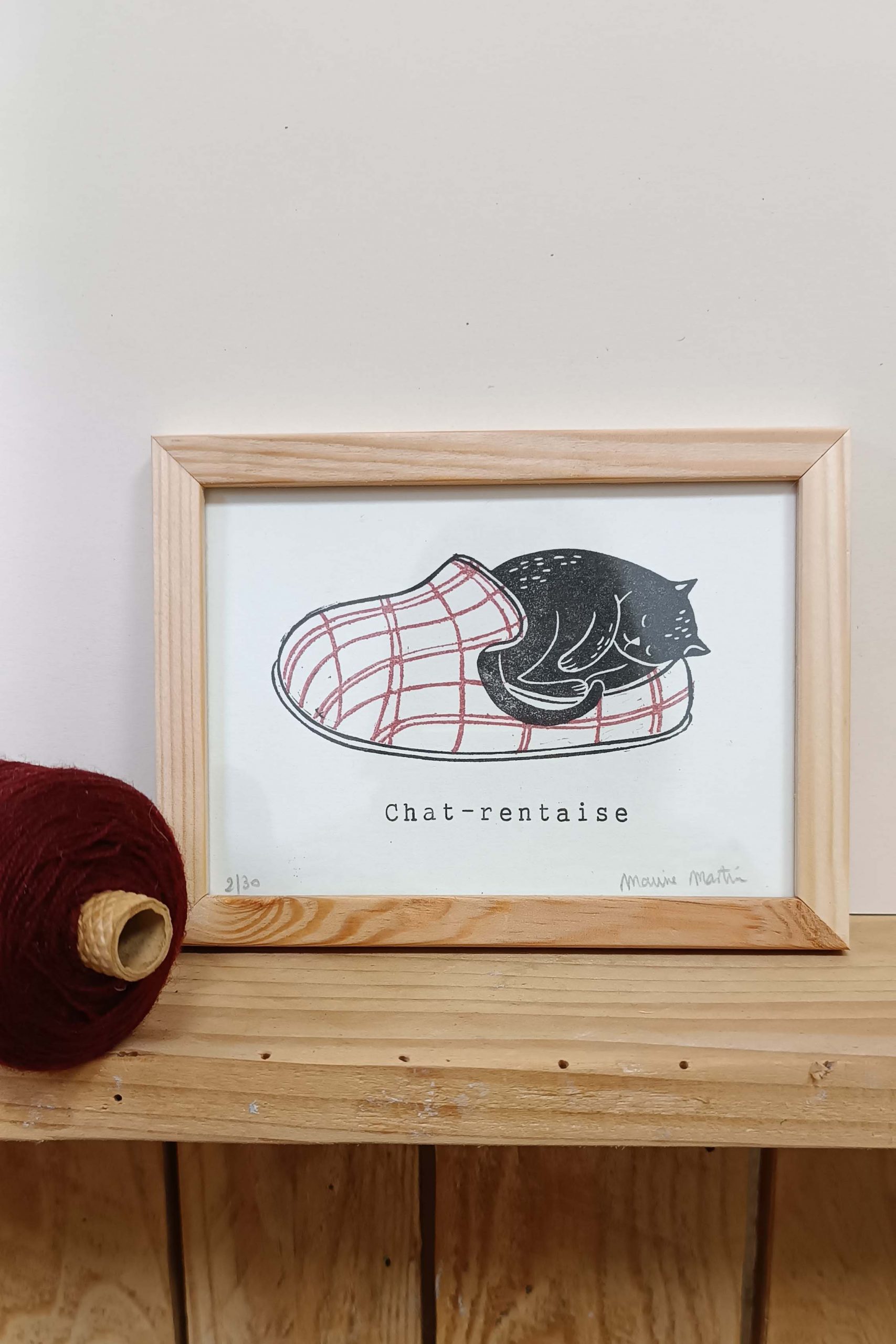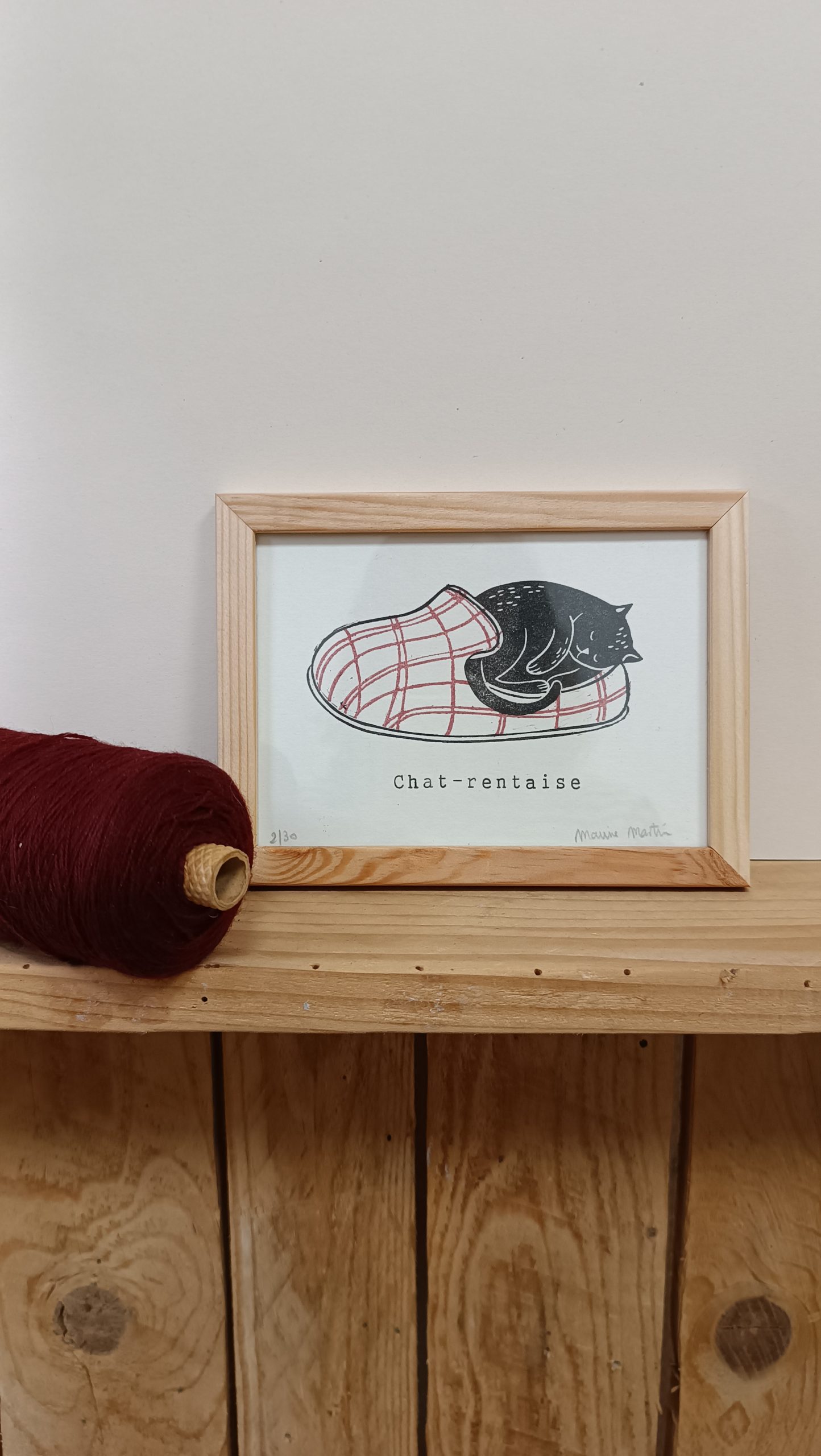 “Chat-rentaise” est une illustration issue de la série des Chats-mots réalisée par mes soins et est imprimée artisanalement en noir et rouge bordeaux.