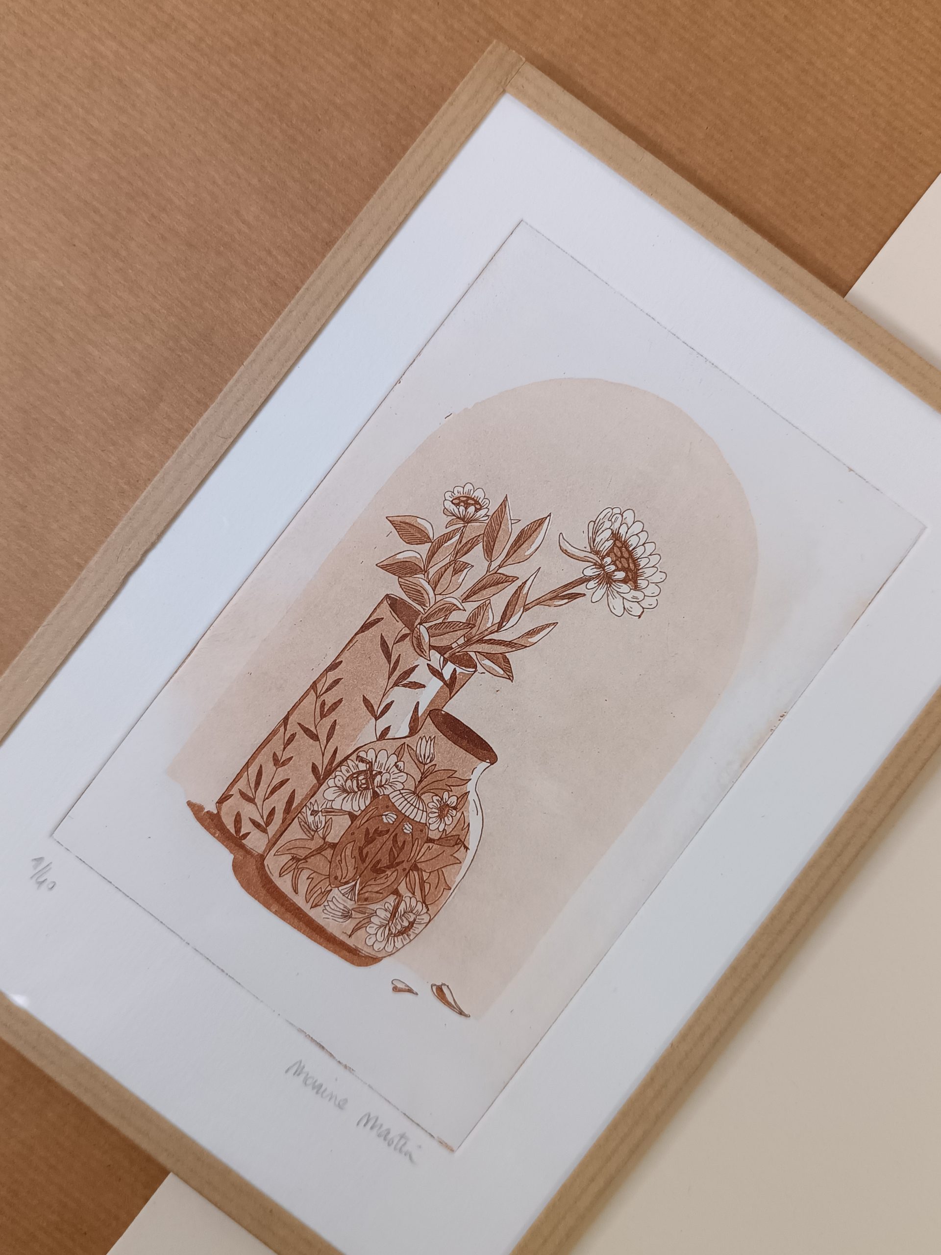 Le cadre n’est pas compris dans la commande. Vous pouvez néanmoins choisir cette option lors de la commande, pour recevoir l’illustration encadrée par mes soins, dans un encadrement kraft 15x21cm.