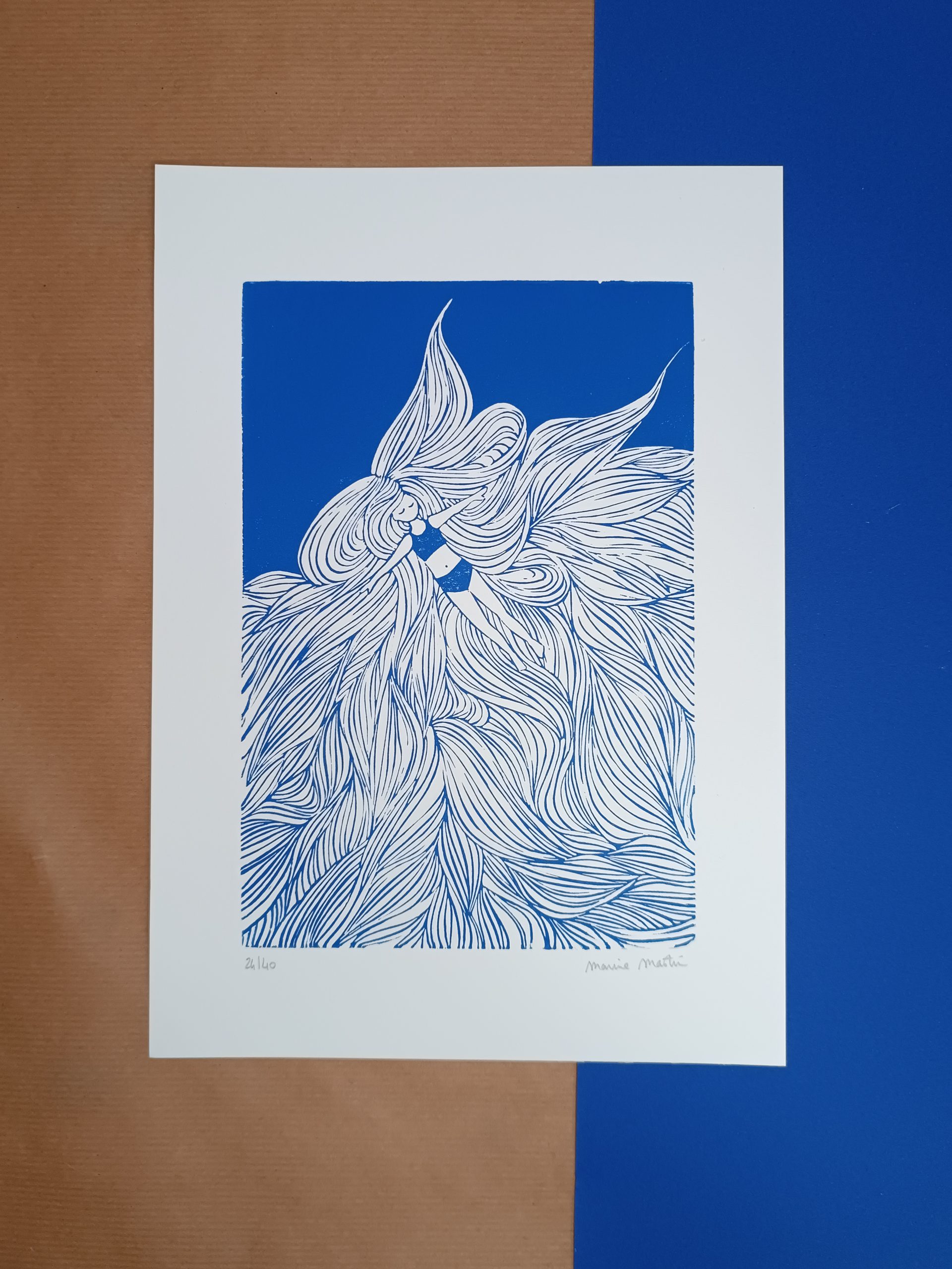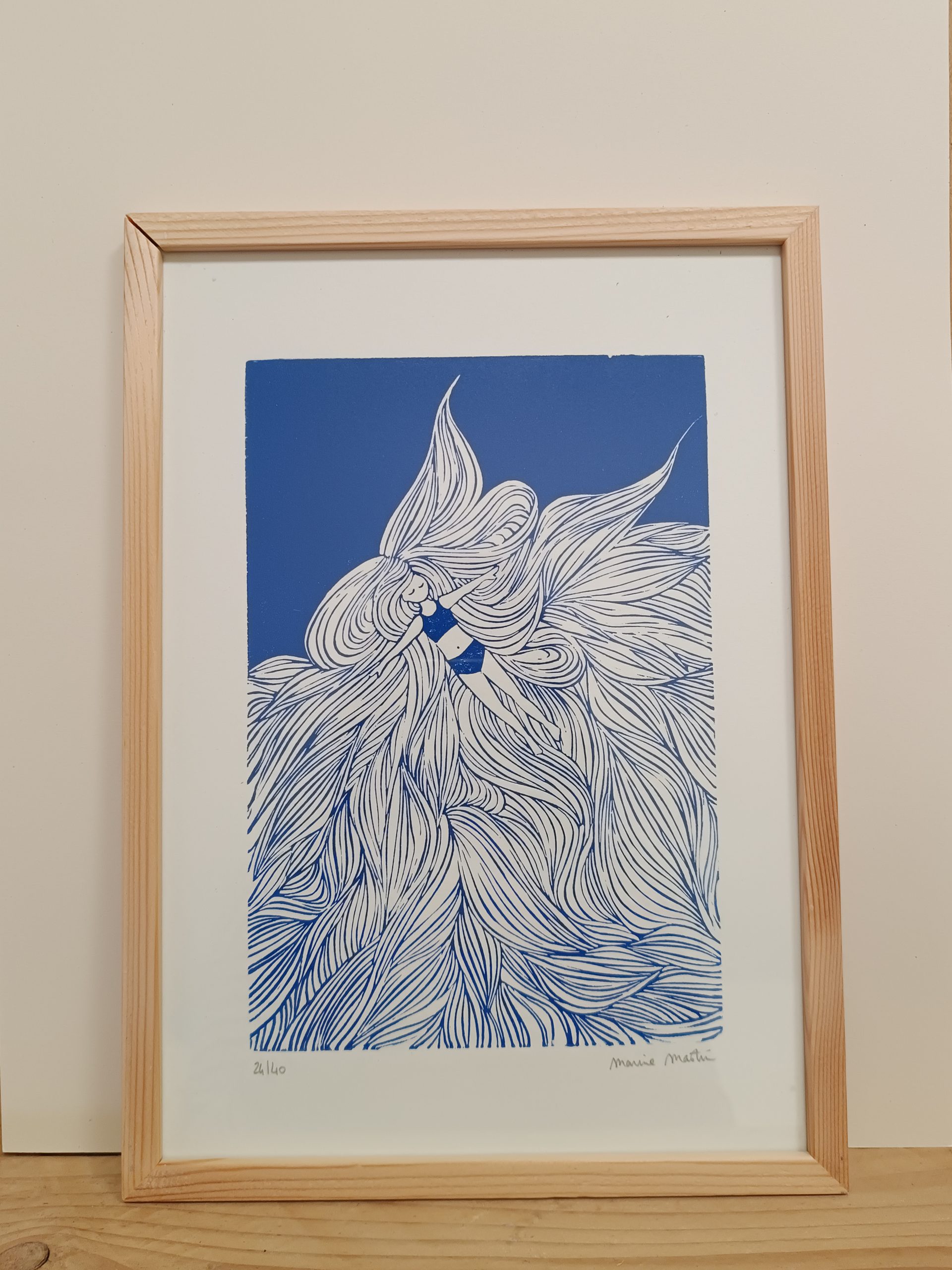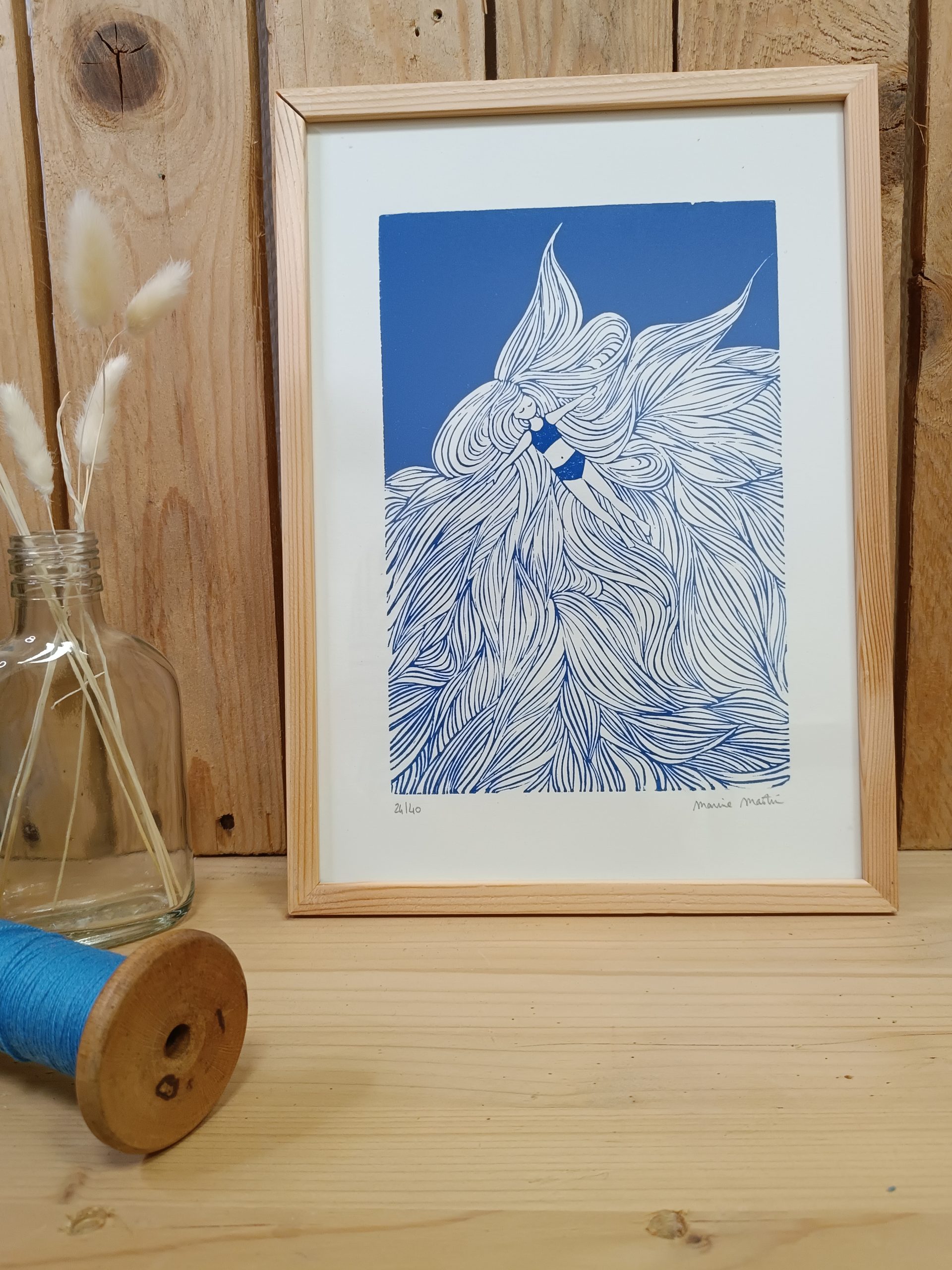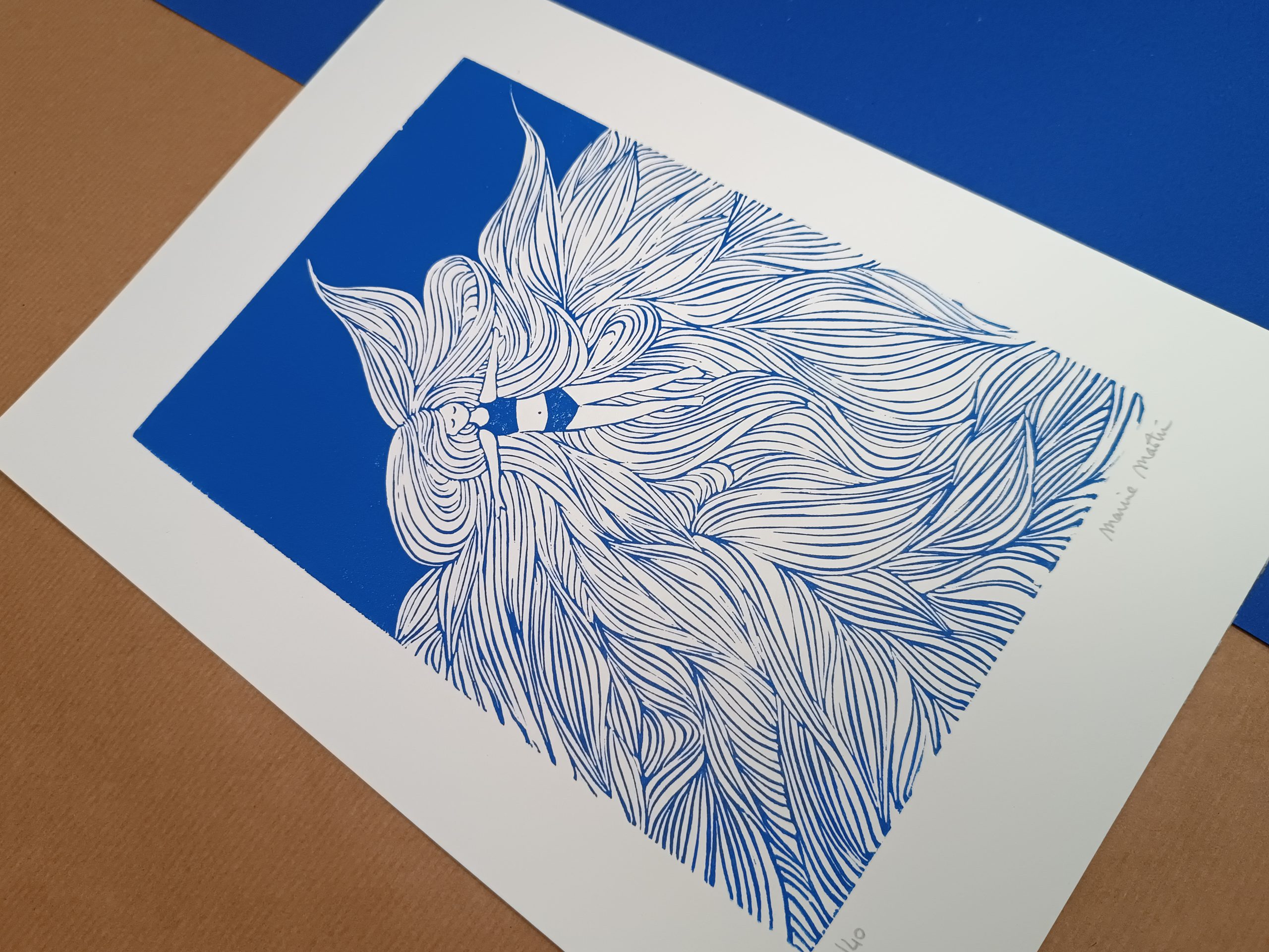C’est une impression originale en linogravure tirée à partir de deux plaques-tampons gravés à la main dans mon atelier, toujours en série limitée. Chaque exemplaire est numéroté.