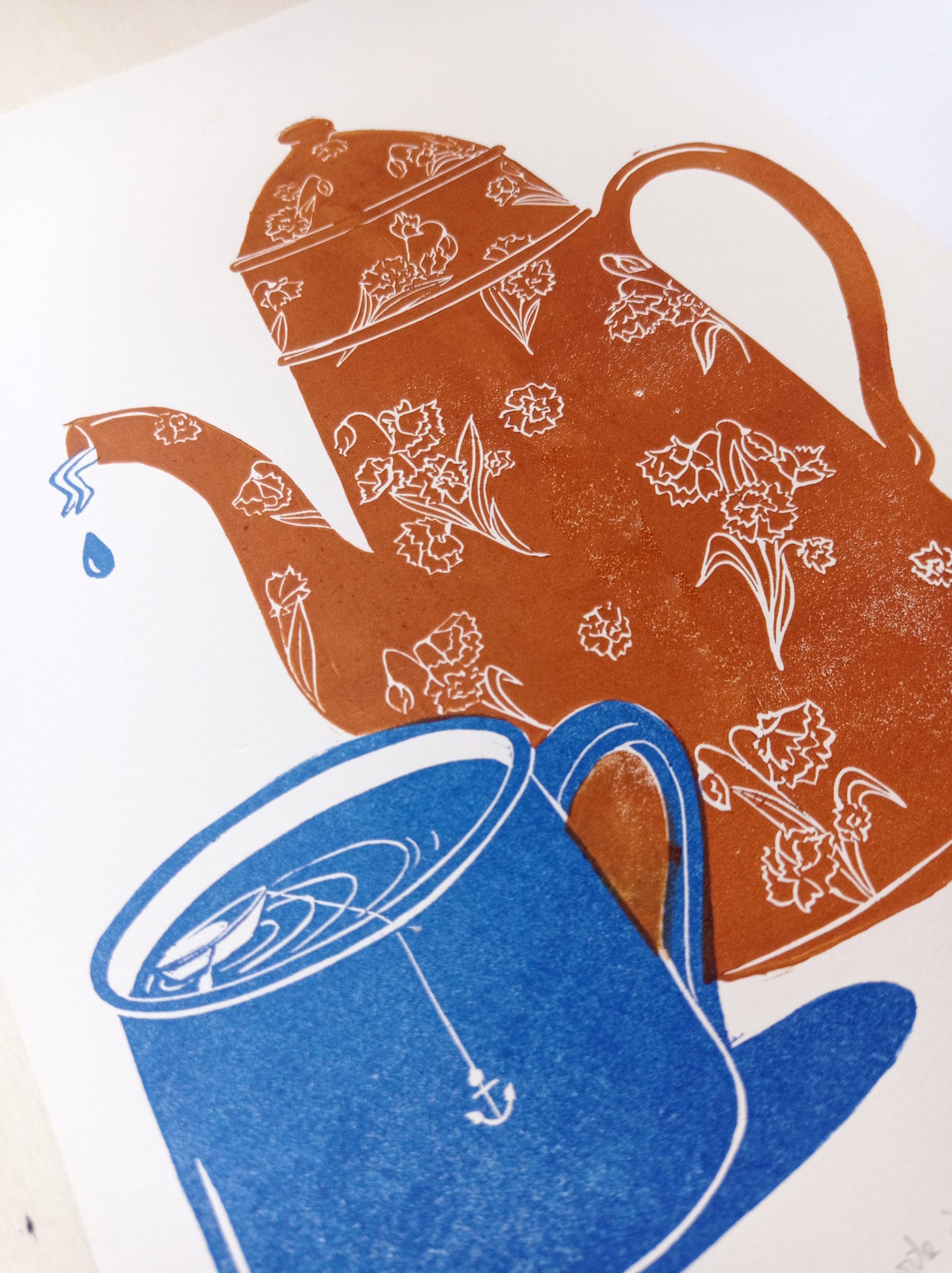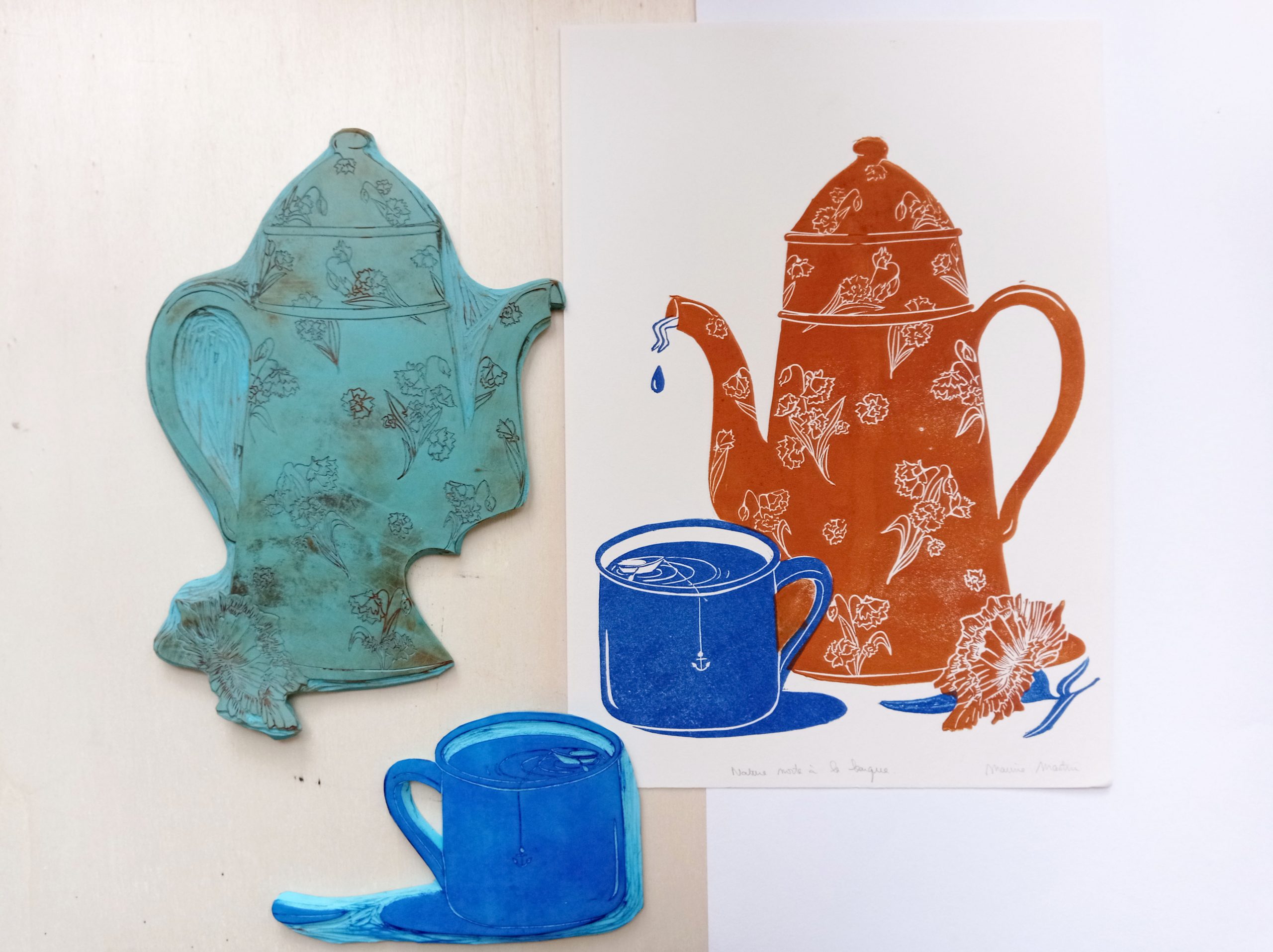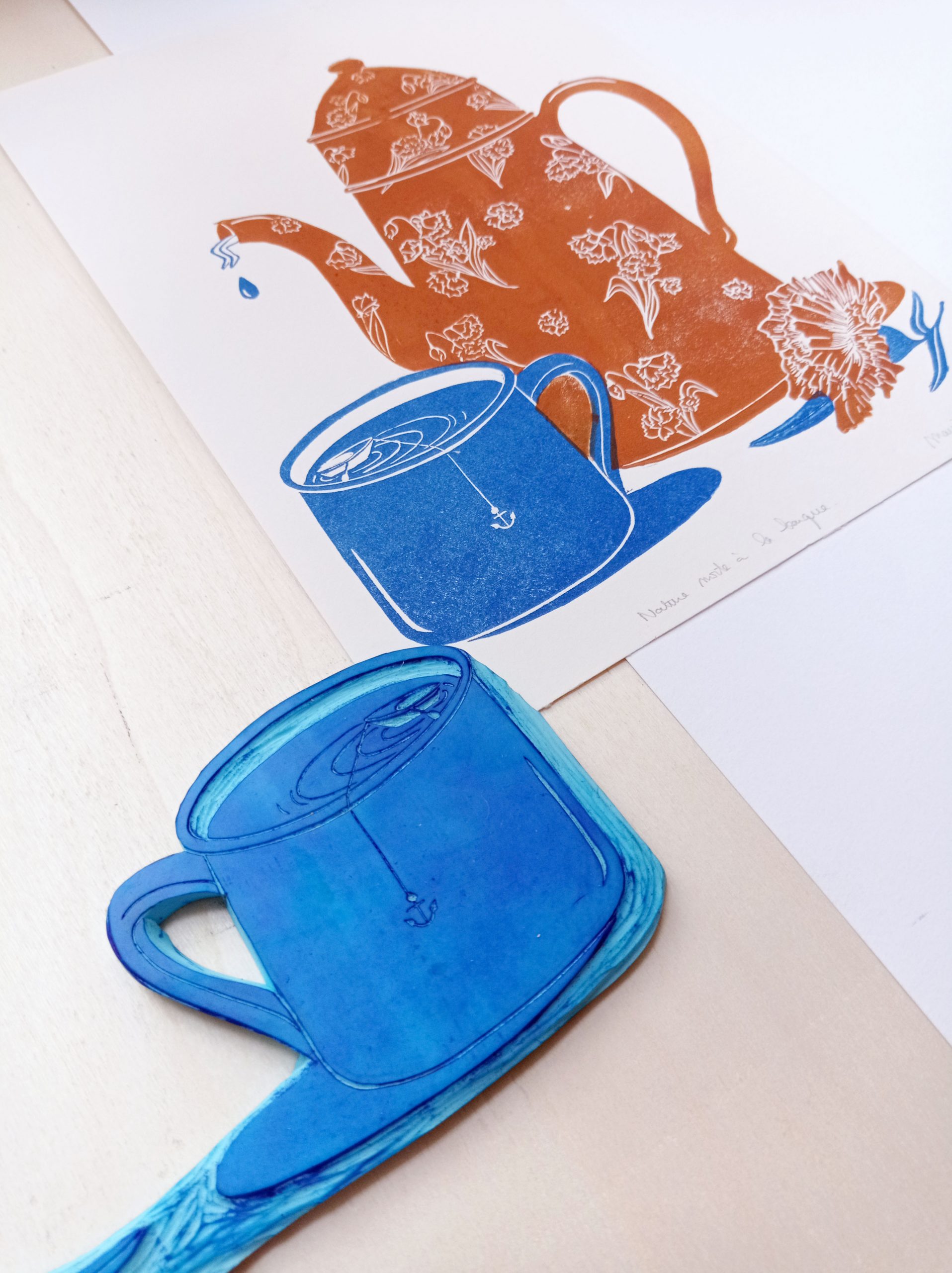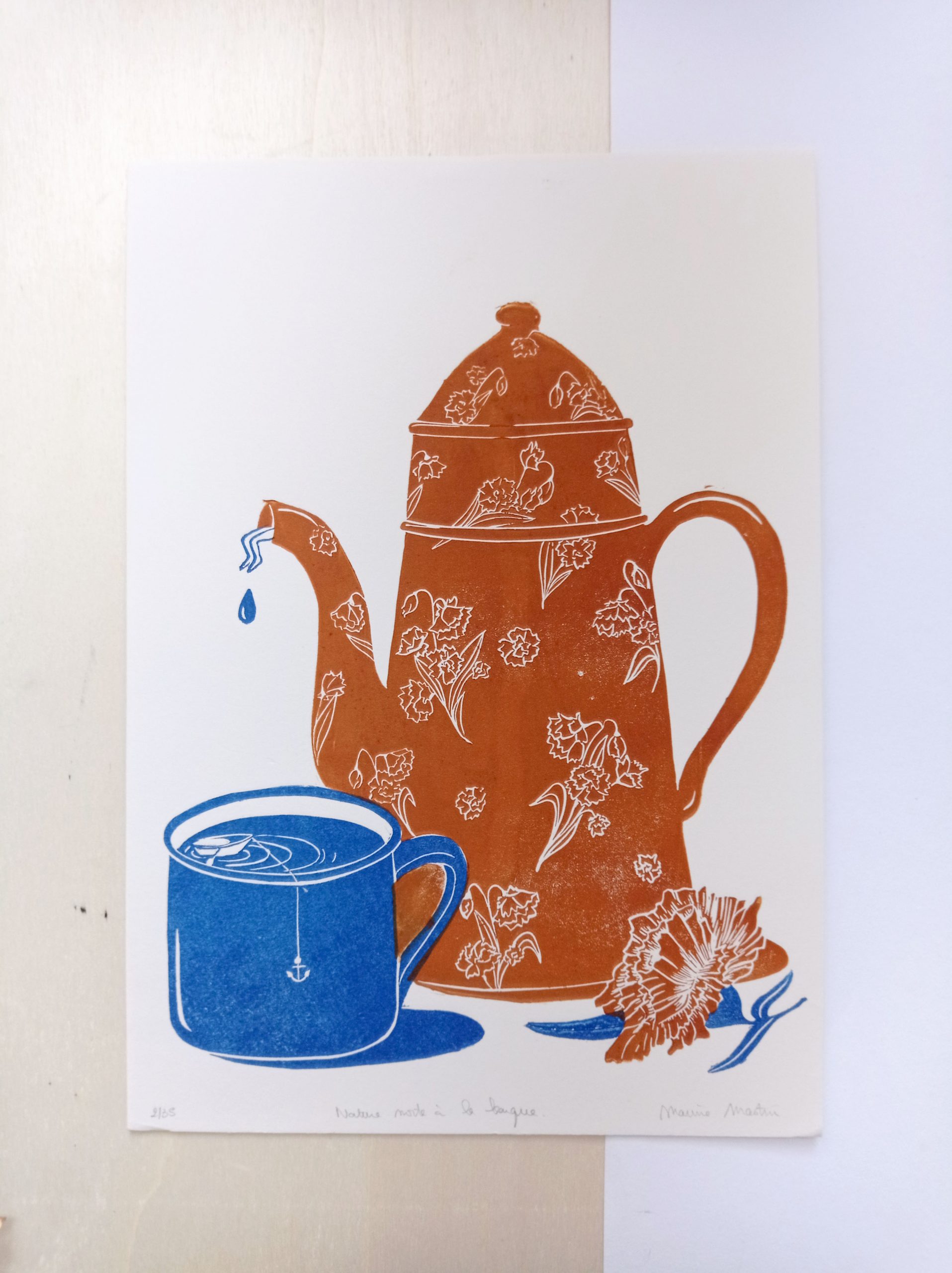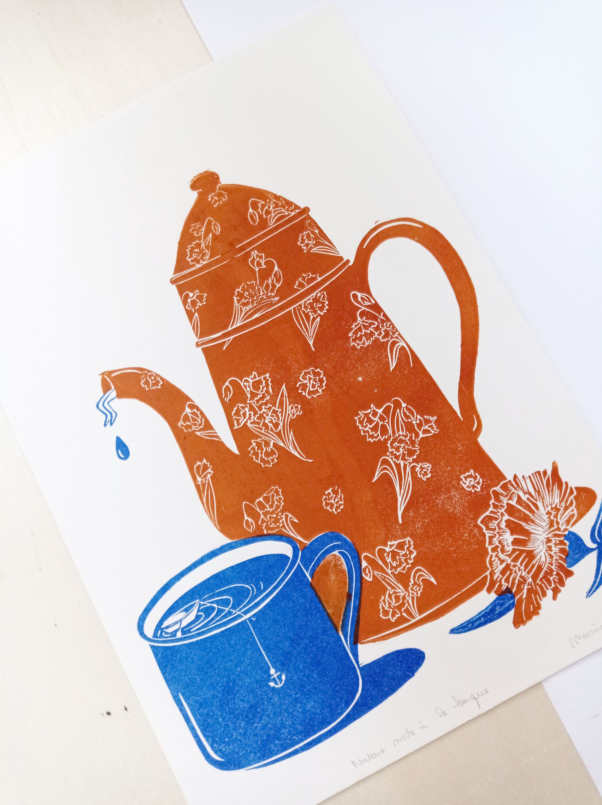 C’est une impression originale en linogravure tirée à partir de deux plaques-tampons gravés à la main dans mon atelier, toujours en série limitée. Chaque exemplaire est numéroté.