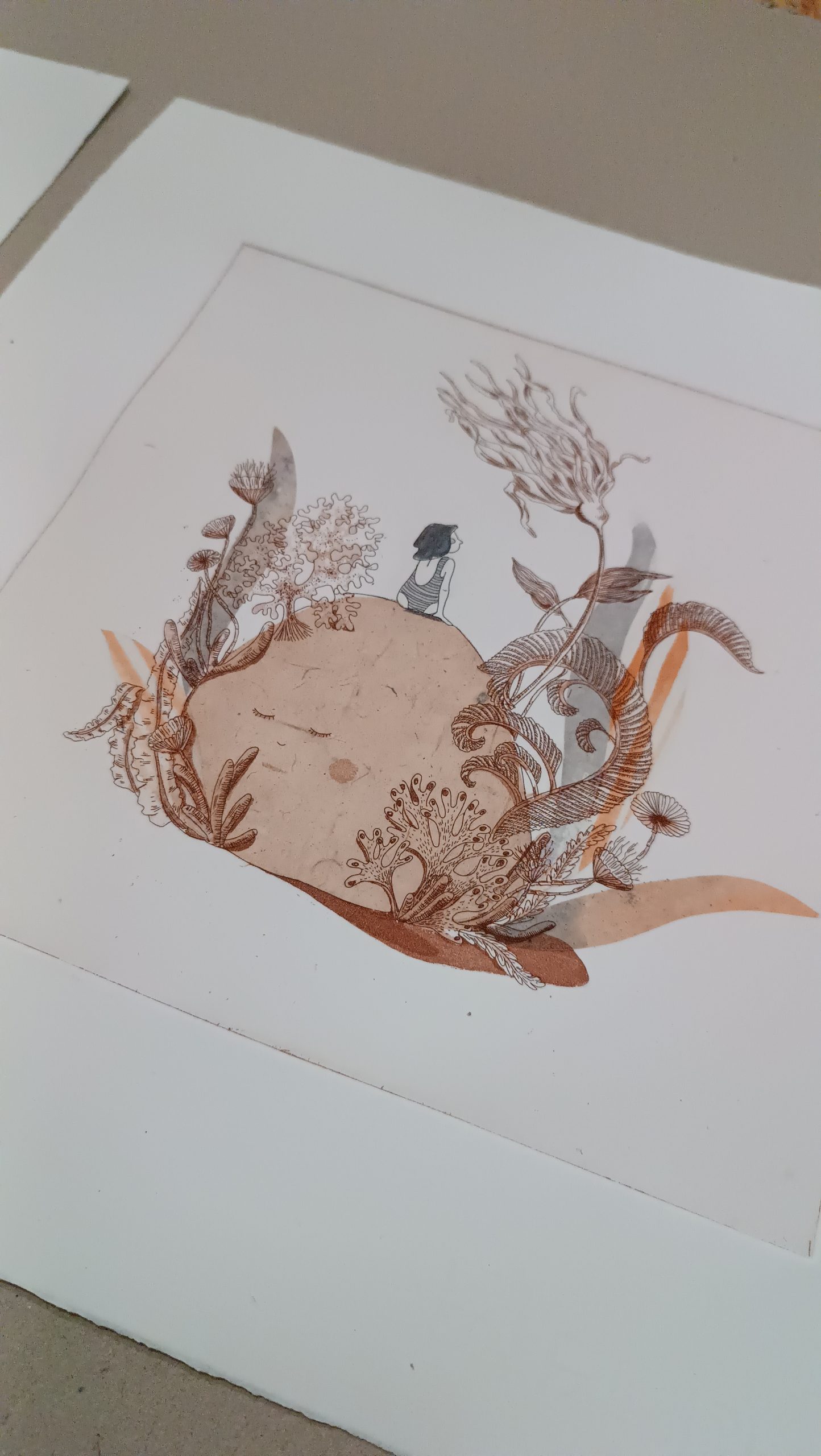 Gravure taille douce, eau forte sur cuivre, aquatinte et chine-collé (papier coloré à partir d’encres végétales).