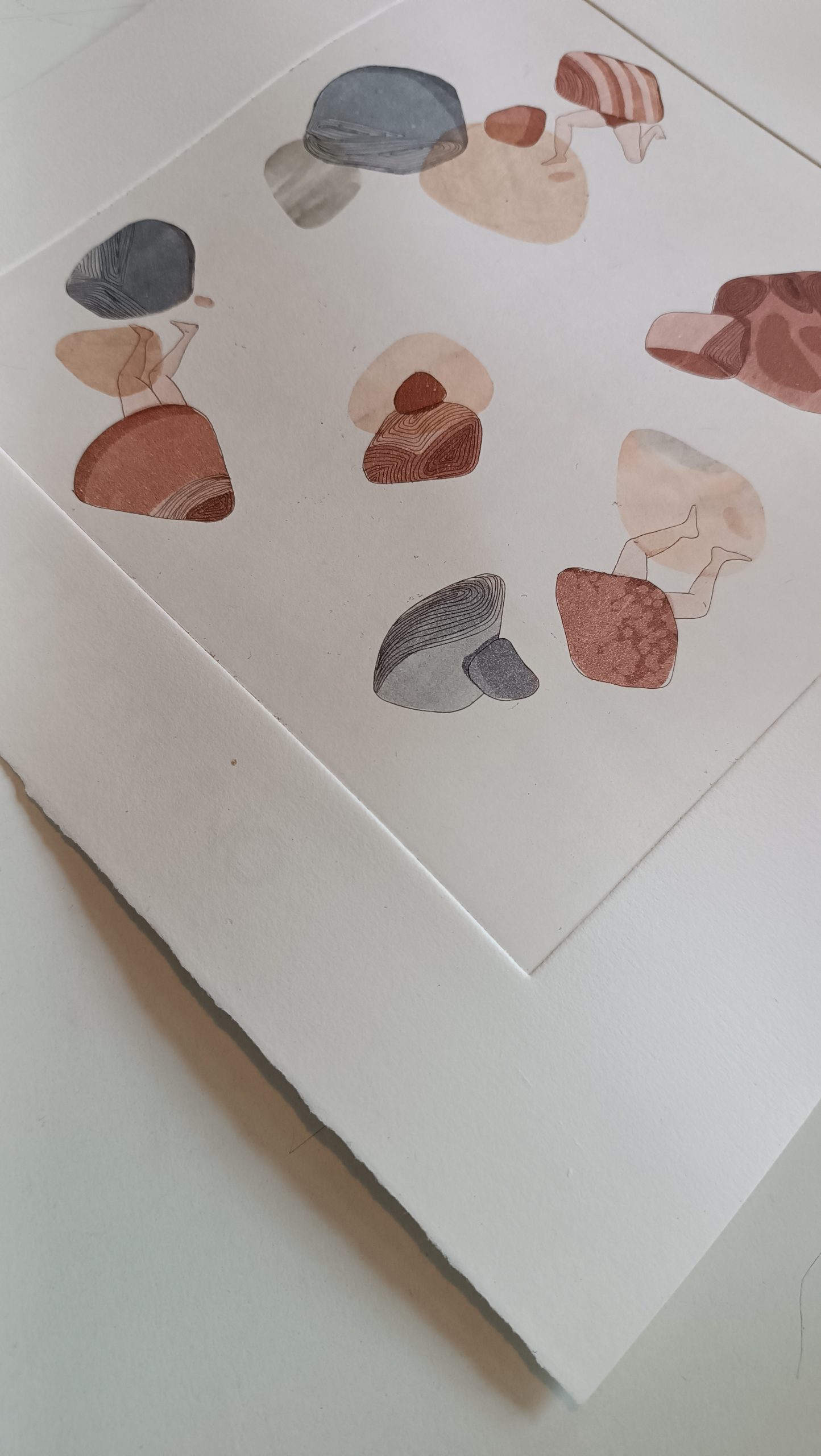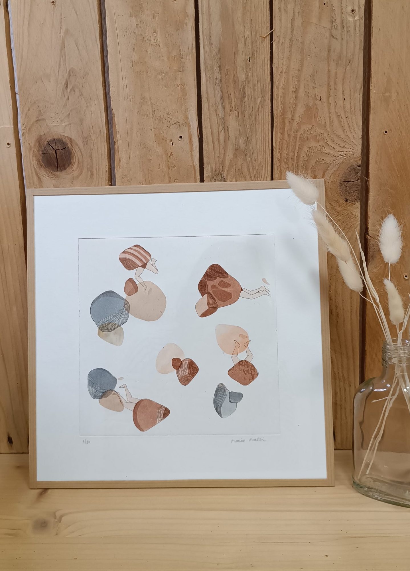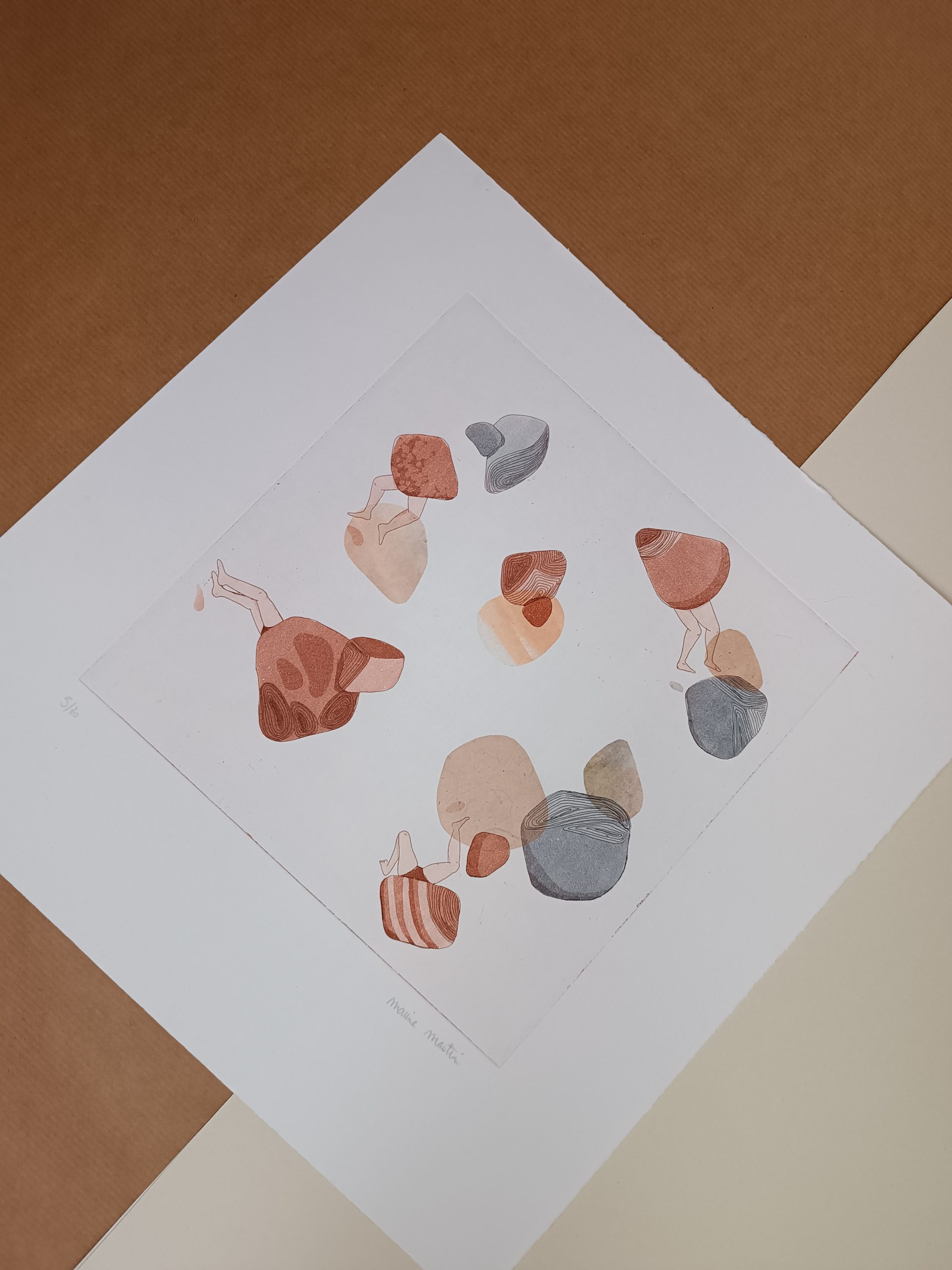 Gravure taille douce, eau forte sur cuivre, aquatinte et chine-collé (papier coloré à partir d’encres végétales).